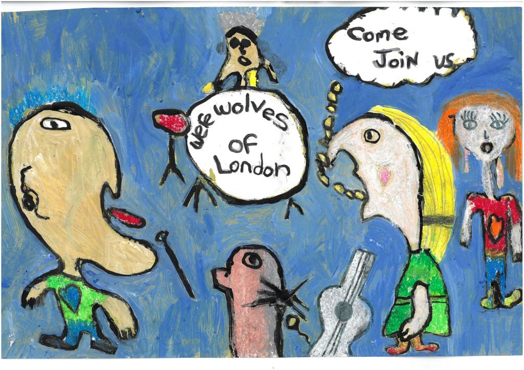“Jack stepped into the garage and sang, "Werewolves of London". He howled a long, melodic wolf howl. The band all stopped and stared with stunned expressions at this scruffy, dirty, singing dog.”